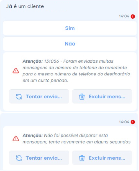 O erro de envio de mensagens acontece principalmente quando muitas mensagens são enviadas para o mesmo contato em um curto período de tempo.